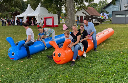 Beim Raupenwettlauf ist Teamwork gefragt: Sechs Personen sitzen auf einer überdimensionalen Raupe und hüpfen gemeinsam Richtung Ziel. Nur wer im richtigen Rhythmus zusammenarbeitet, erreicht als Erster die Ziellinie.
